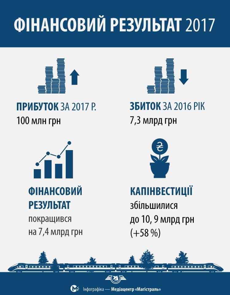 100 млн гривень прибутку у 2017 році. Е&Y заявила про покращення фінансового результату Укрзалізниці та вихід на прибуткову діяльність.